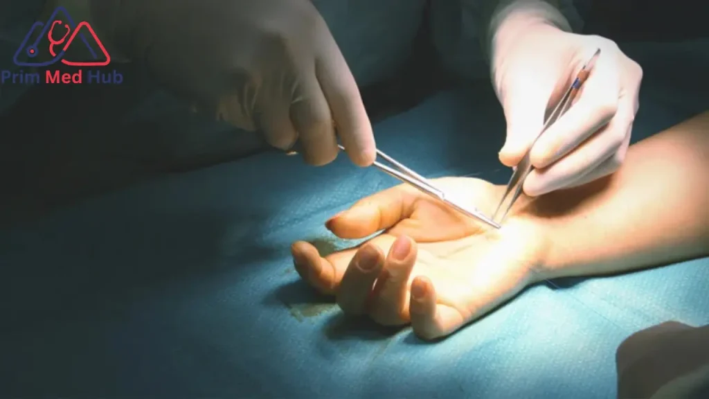 - يقوم الطبيب بعمل شق صغير في منطقة الرسغ أو اليد.